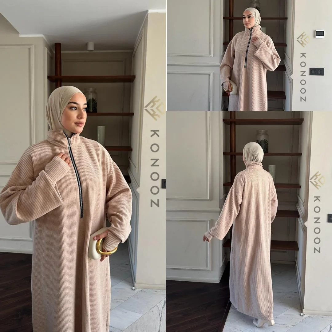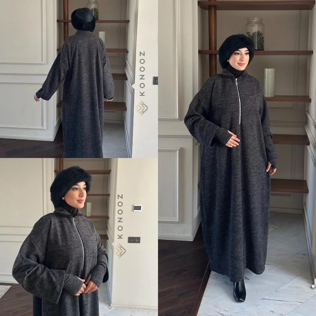 عباية شتوية بثوب قطيفة دافئ وسخون، تصميم محتشم وأنيق مزوّد بسنسلة تضيف لمسة فخامة ناعمة.