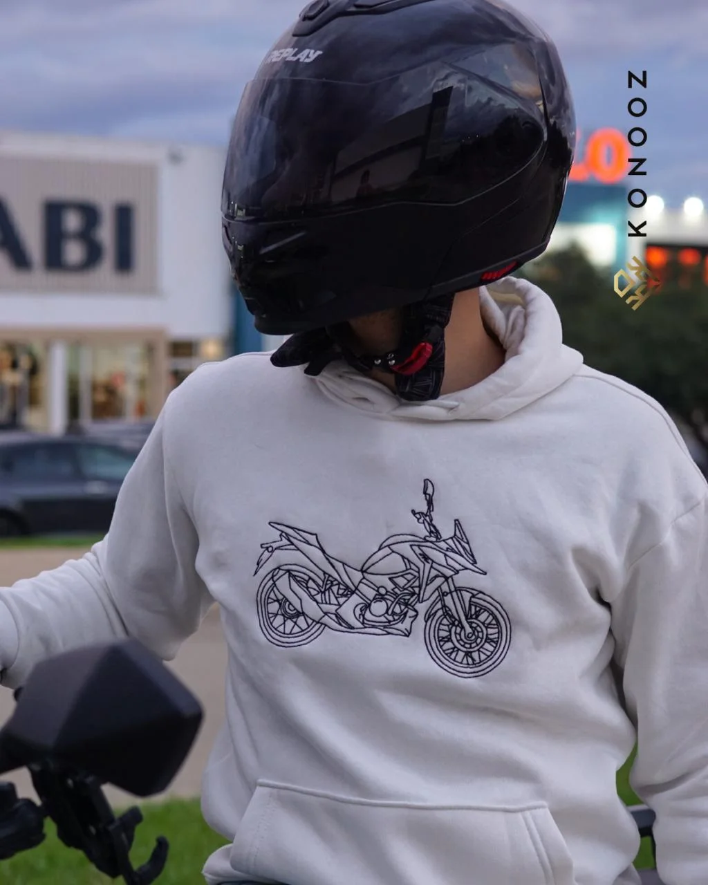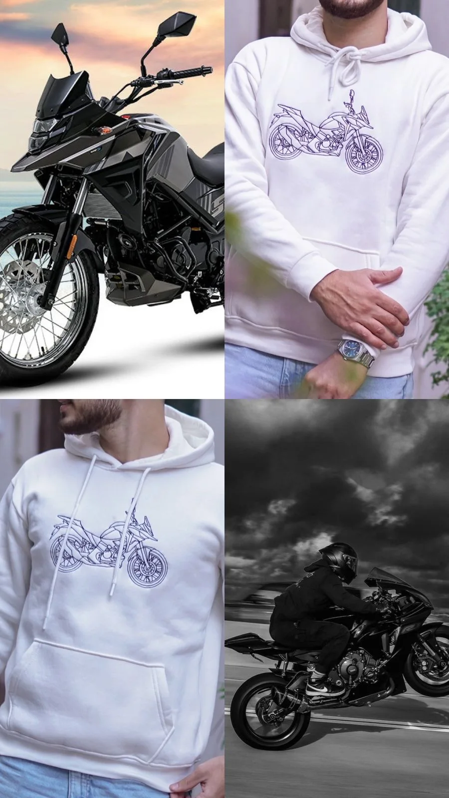 قماش أبيض تركي Premium معالج ضد التحبّب، ملمس ناعم ومريح. التطريز عبارة عن موتور عصري يبرز الشغف بالحركة والمغامرة، تصميم عملي وعصري يناسب كل الأوقات.