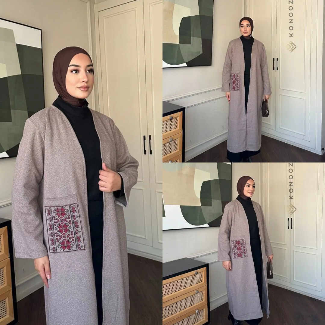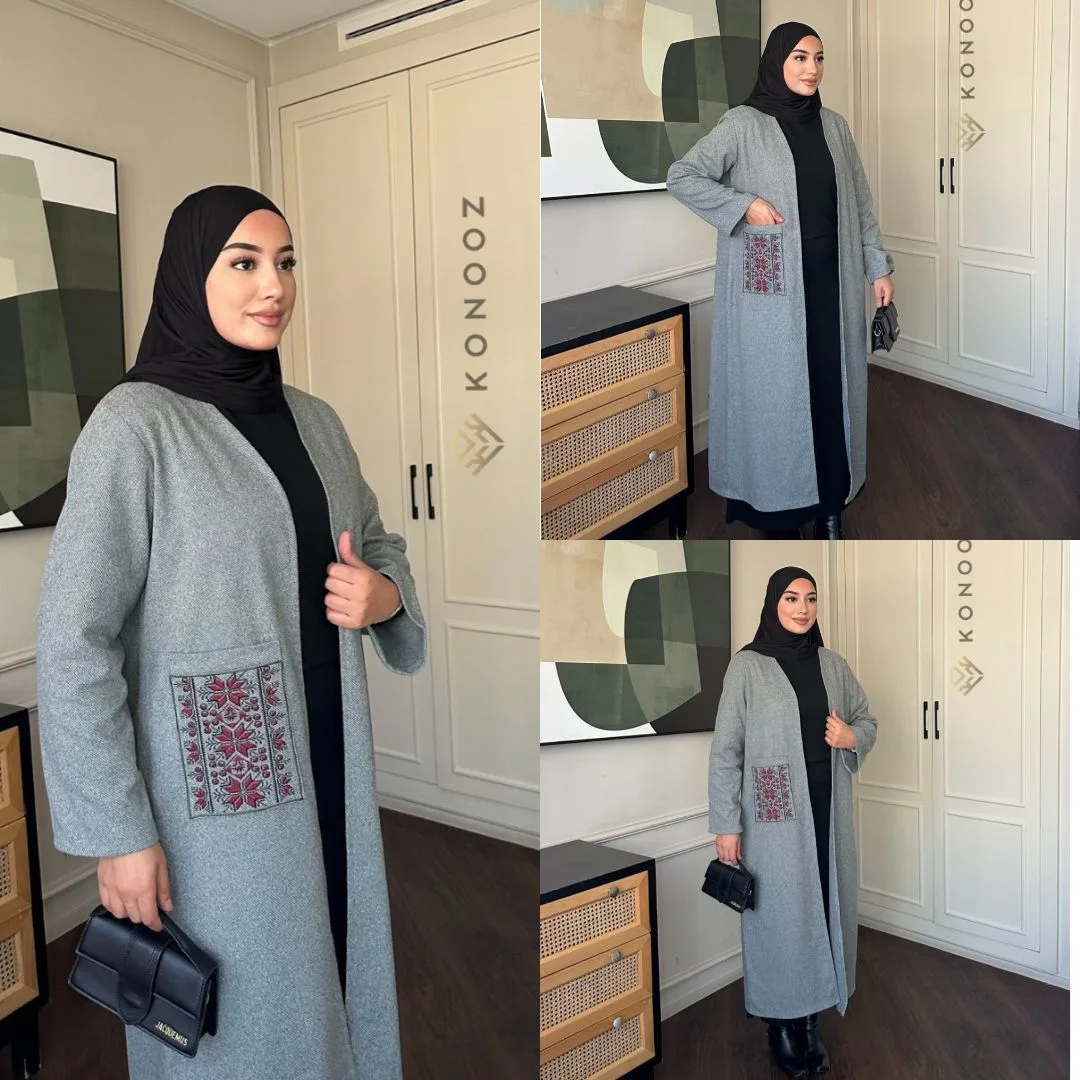 قصة طويلة ومحتشمة تعزز الأناقة، مع جيب مطرز يضيف لمسة فخامة ناعمة ويجعل القطعة مختلفة ومميزة.