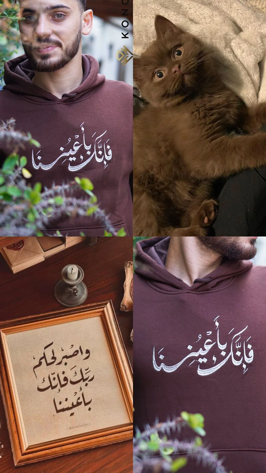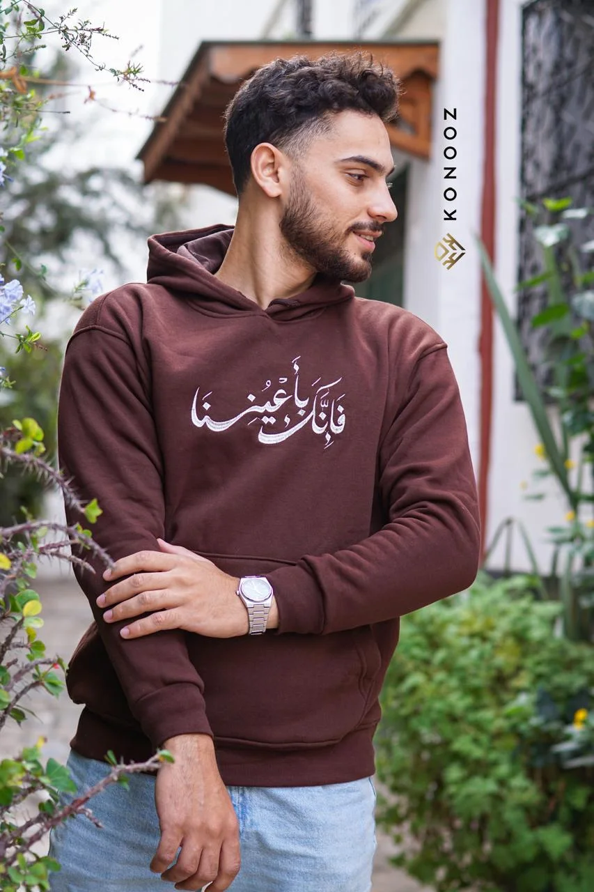 قماش بني غامق بجمالية كلاسيكية، وتطريز بيج لعبارة “فإنك بأعيننا” المستوحاة من الآية القرآنية، لتكون قطعة تذكّر بالحفظ والعناية أينما كنت. تصميم راقٍ وهادئ يناسب كل يوم.