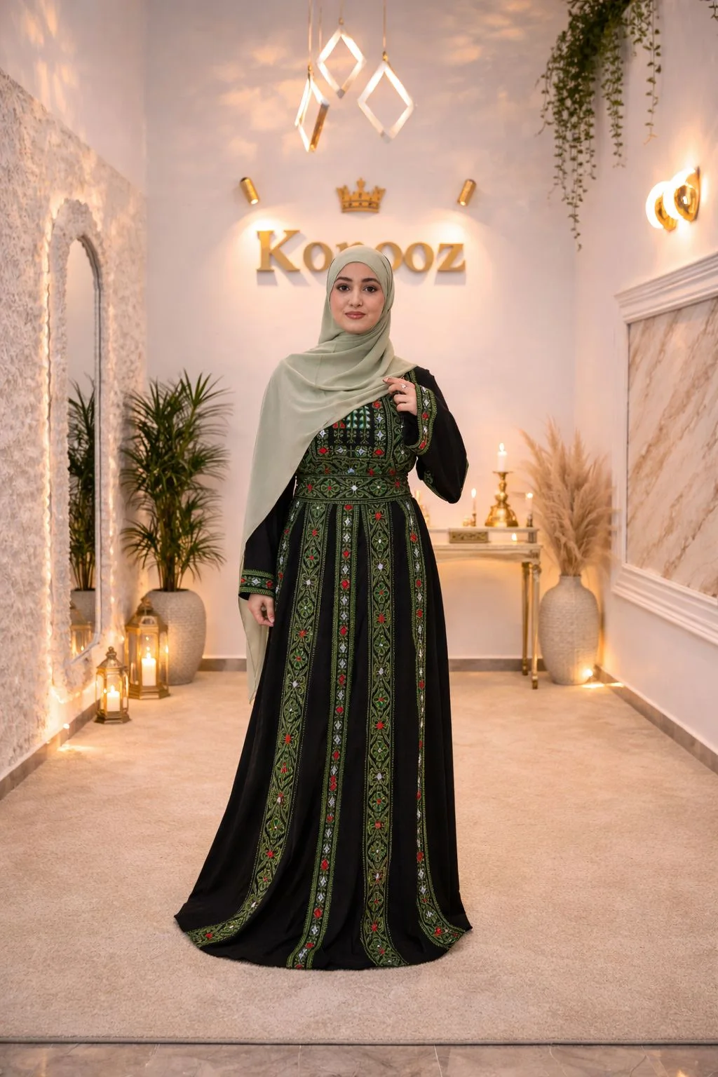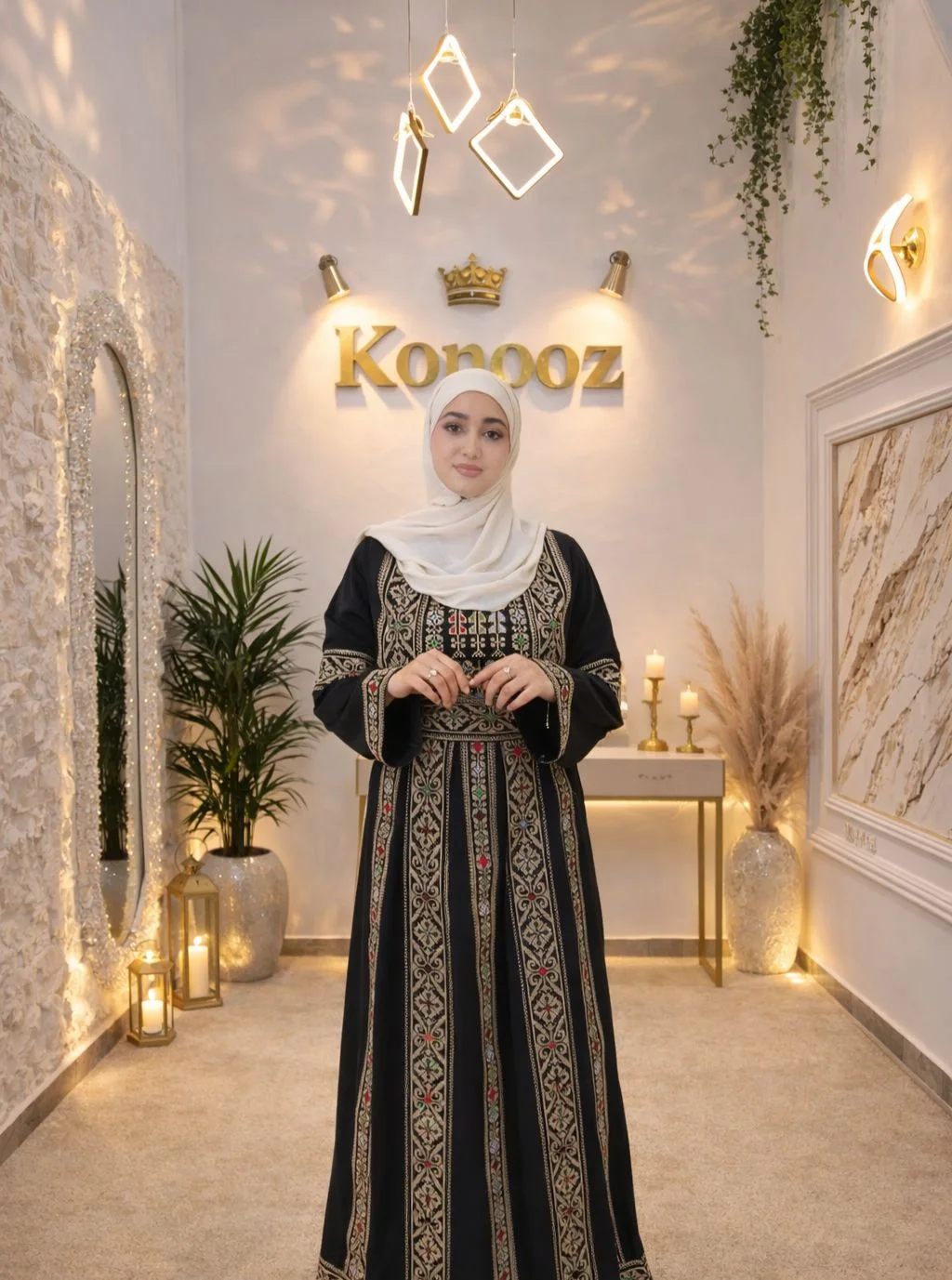 عباية سوداء مطرزة بتطريز أحمر متقن، تصميم طويل وانسيابي يبرز الجسم بشكل جميل ويمنحك إطلالة قوية ومميّزة تبرز الحضور وتلفت الأنظار.